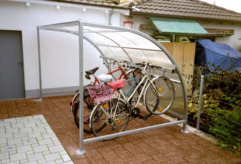 Bei diesem Velounterstand besteht der Vorteil, dass die Fahrradüberdachung gleichzeitig auch eine Rückwand bildet. So bietet der Minirondo einen guten Schutz vor Wind und Wetter für Ihre Fahrräder. Die Bedachung ist aus alterungs- und witterungsbeständigem Polycarbonat-Doppelsteg, transparent, 6mm stark oder wahlweise aus Acrylglas 3mm XT. Dieses wird mit rostfreien Bändern auf die solide feuerverzinkte Konstruktion gespannt. Verstellbare Füsse zum Niveau-Ausgleich und zur Verankerung des Velounterstand am Boden sind inklusive.