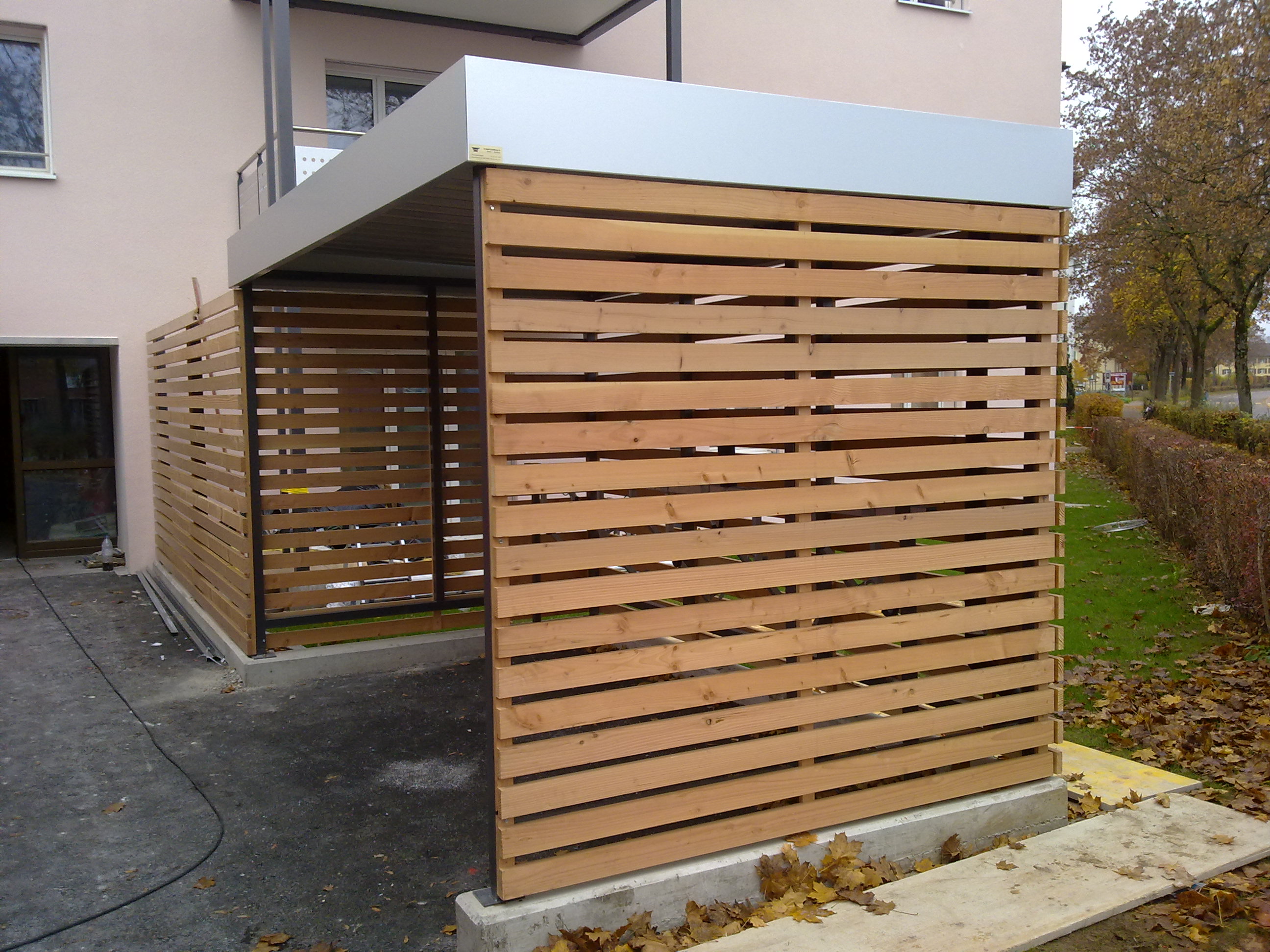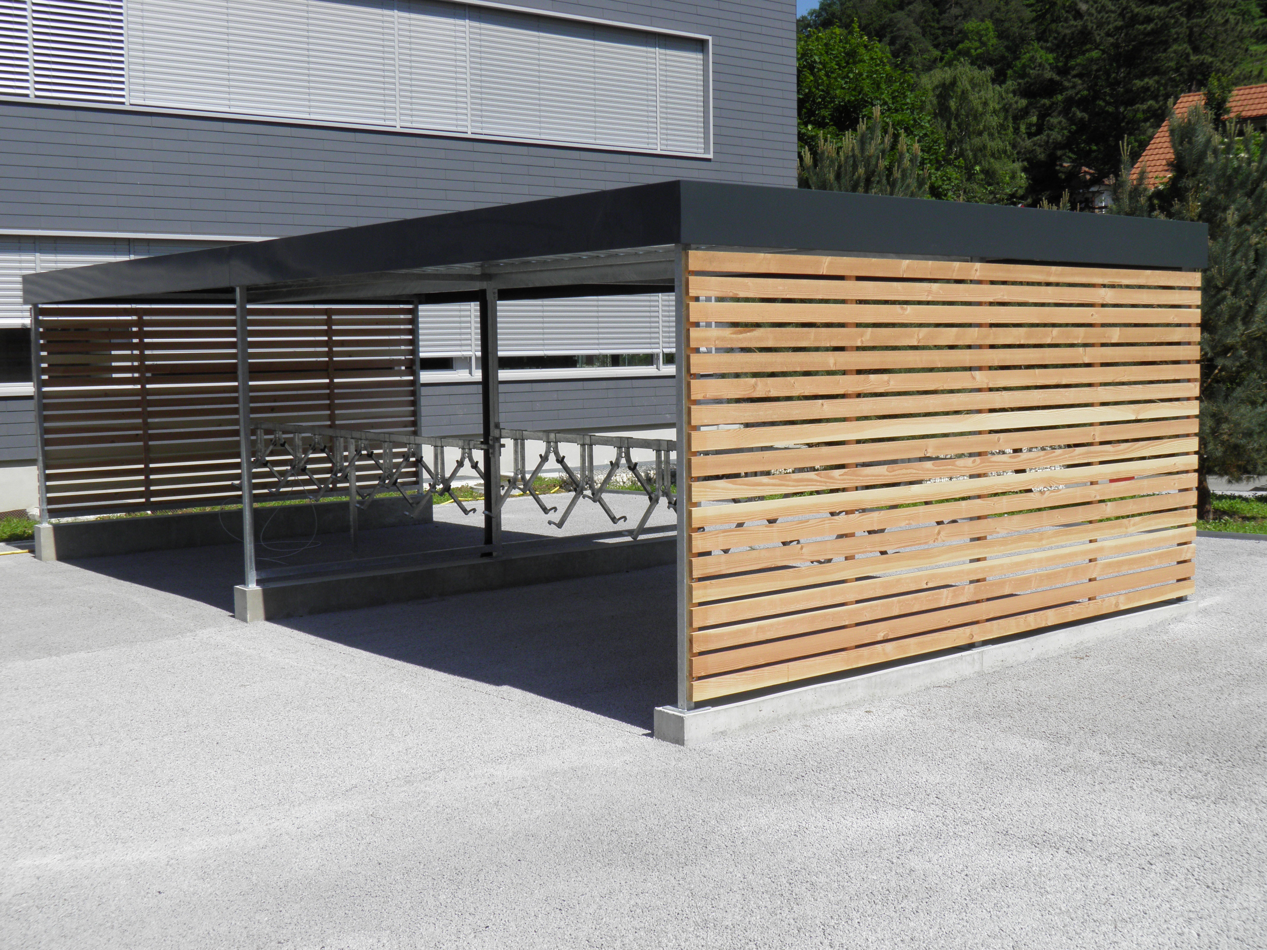 La tôle trapézoïdale, qui sert de toit, est couverte par une blende allant autour. Une gouttière intégrée avec tuyau de vidange dirige l'eau de pluie sur le sol. Tout d'acier galvanisé à chaud.