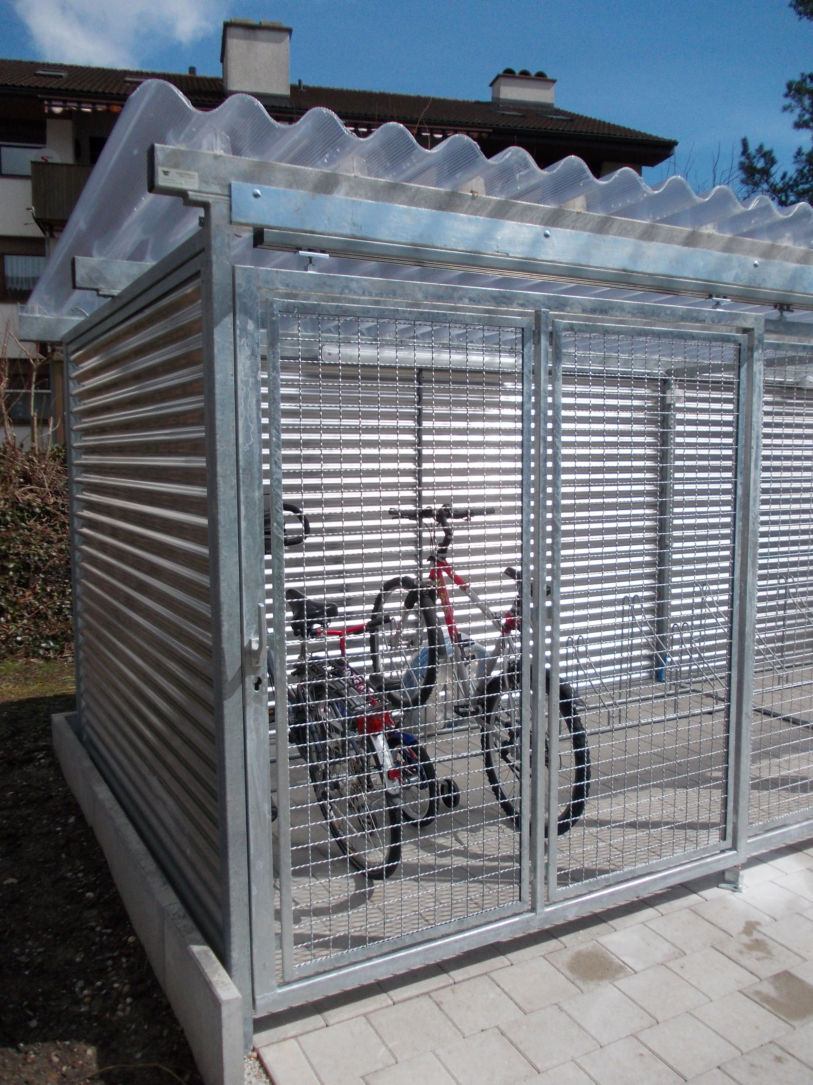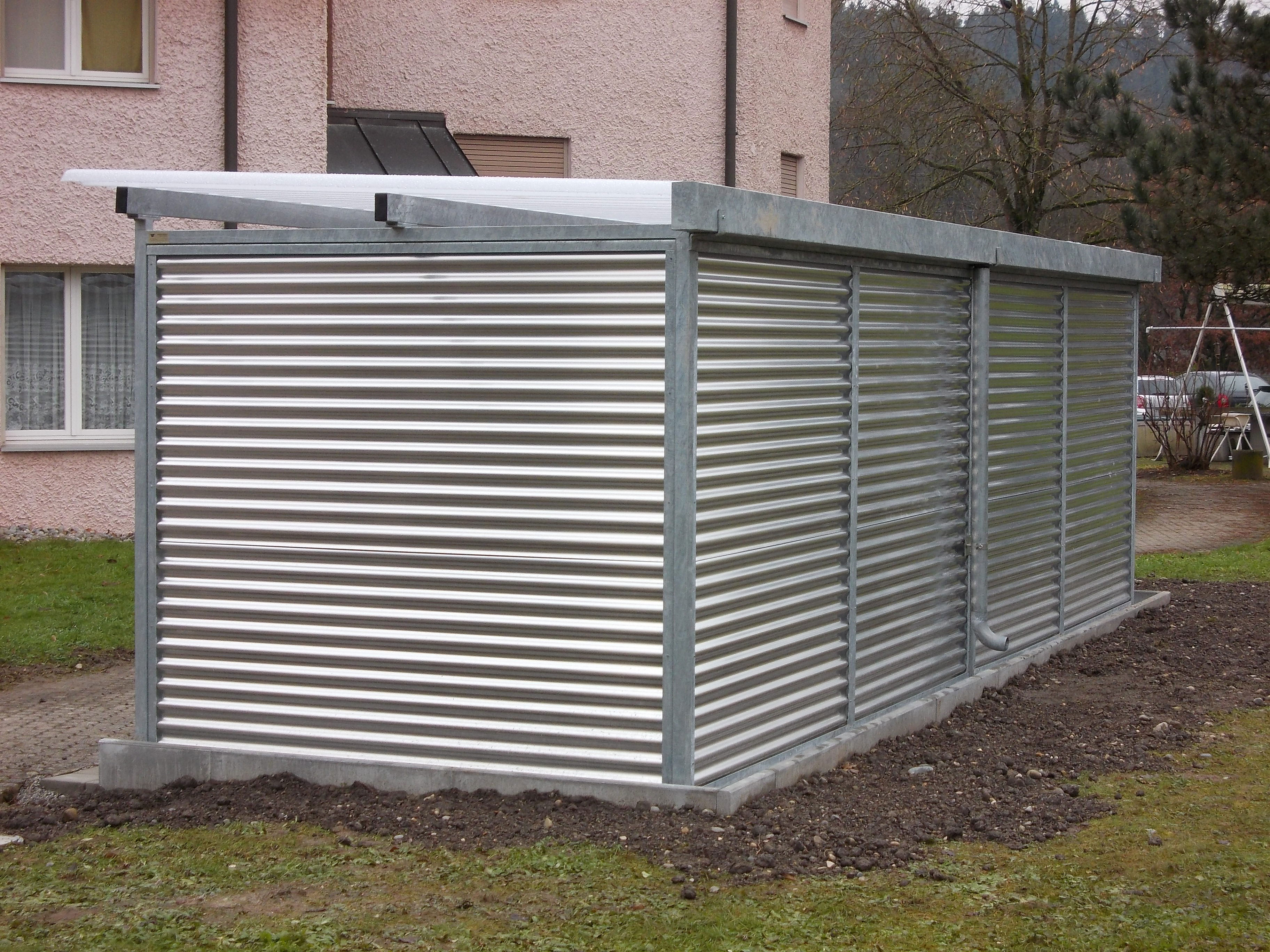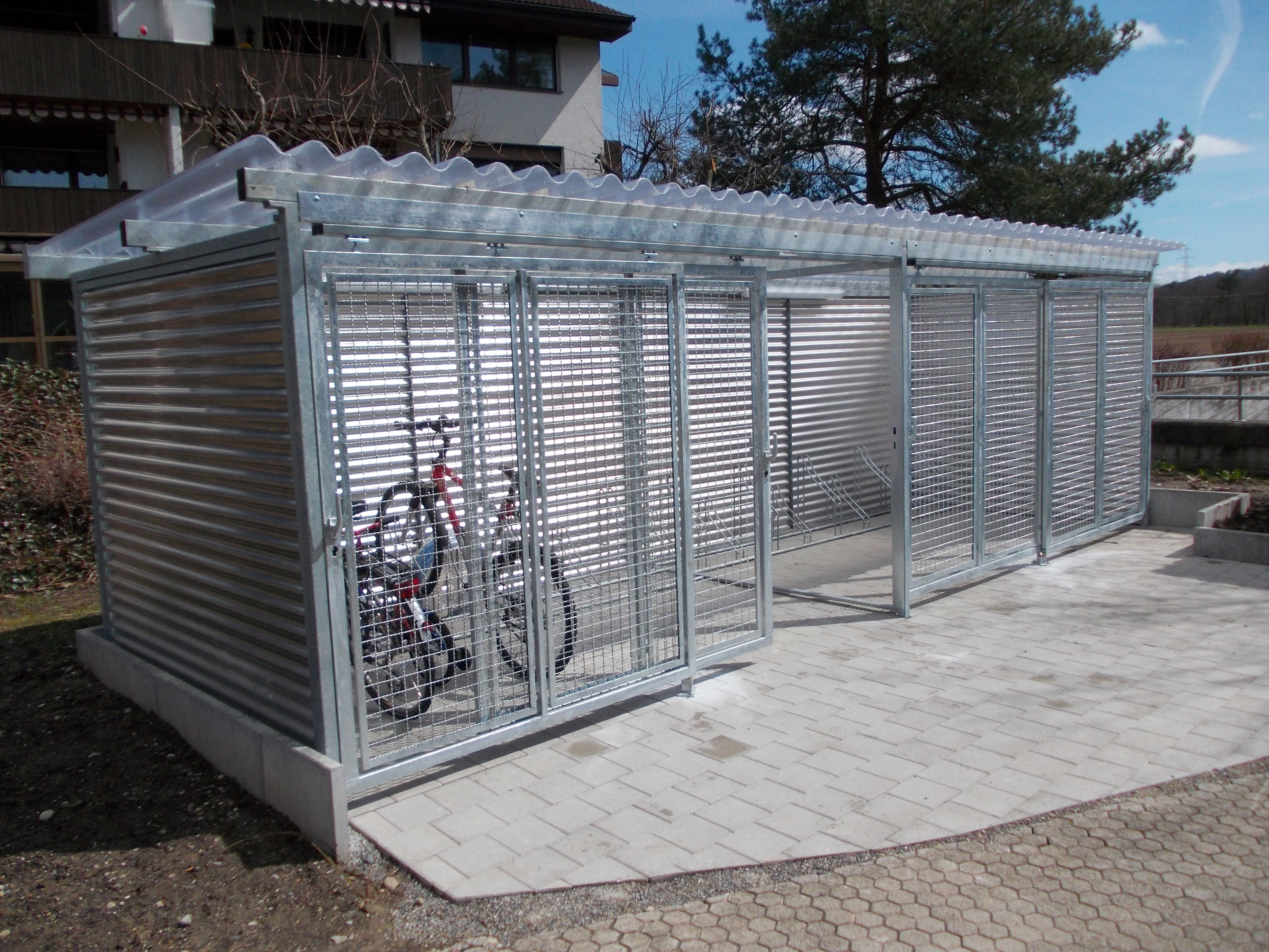 Des parois latérales et arrières en aluminium ondulé et des portes coulissantes sont disponibles pour cet abri et offrent ainsi une protection optimale pour les vélos
