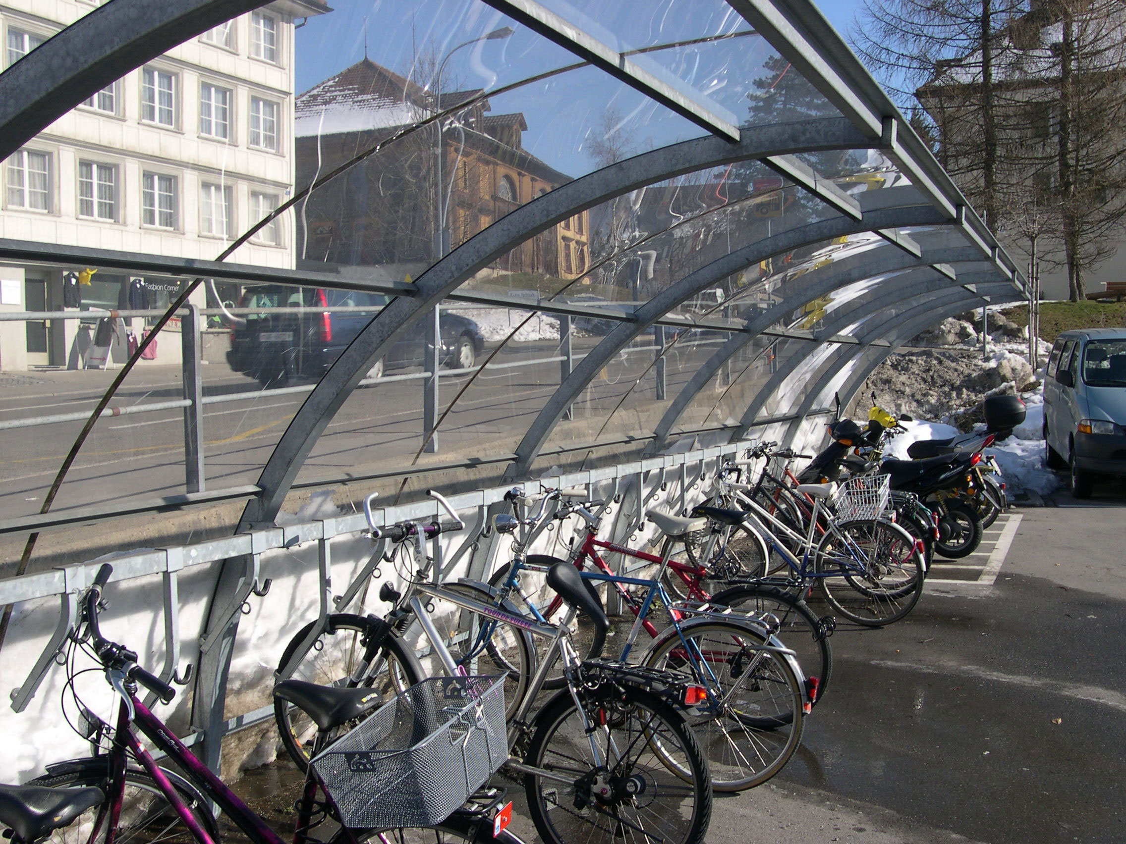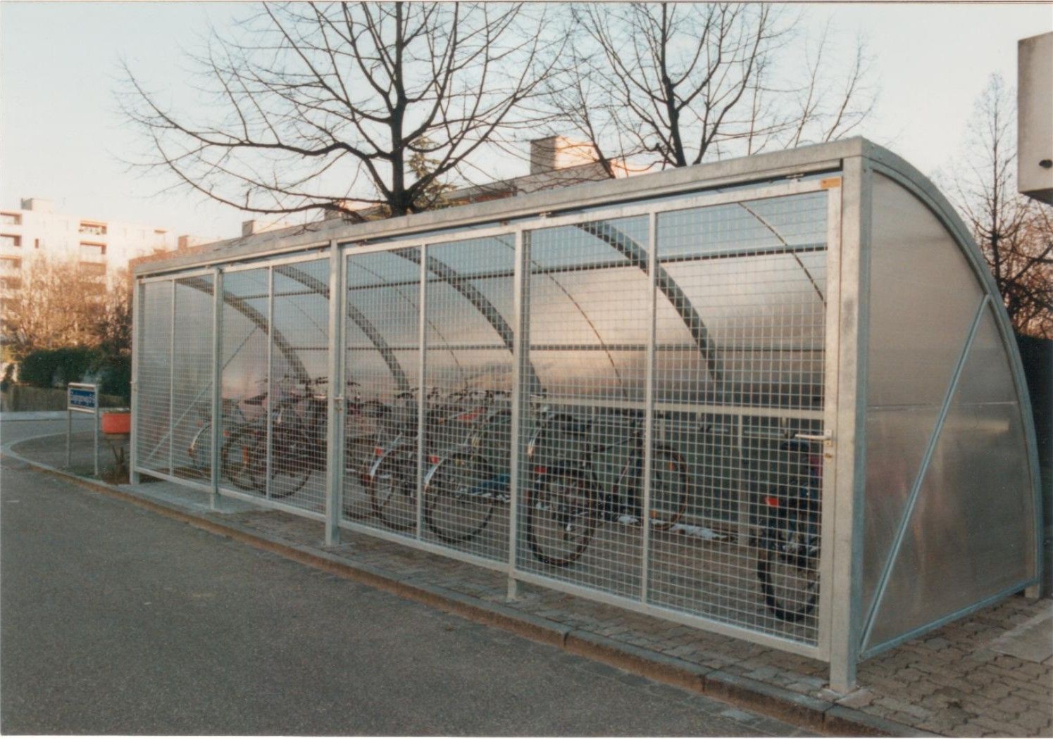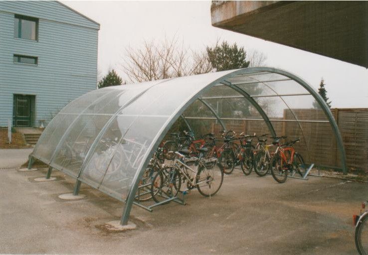 Cet abri n'a pas besoin de supports supplémentaires à l'avant. Le toit forme en même temps une paroi arrière, ce qui offre une protection idéale de vos deux-roues contre le vent et les intempéries. Le toit est fait soit de polycarbonate à double pont contre le vieillissement et les intempéries ou de verre acrylique 3mm limpide XT qui est tendu avec des bandes d'acier inoxydable sans trou sur les arcs surbaissés. Les parois latérales et les portes coulissantes, ainsi que les porte-vélos qui vont avec, complètent cet abri.