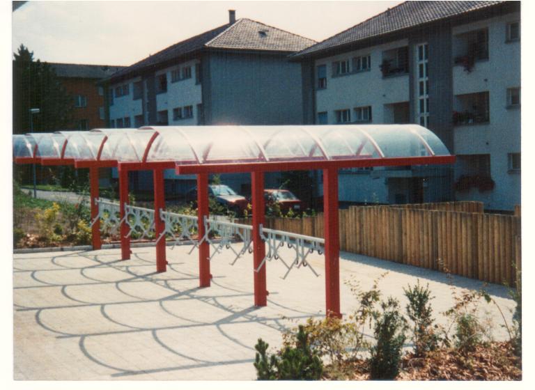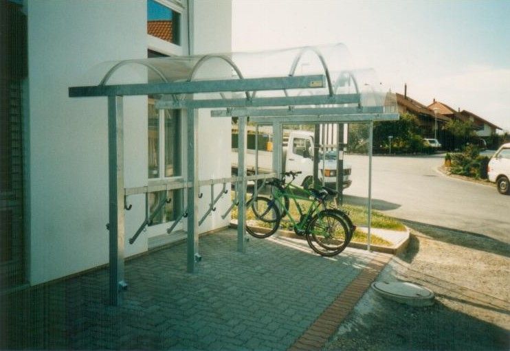 Le toit est fait de verre teinté acrylique 3mm XT ou bronze clair. Les parois latérales et la paroi arrière (pour les modèles à sens unique), ainsi que les porte-vélos HE 90 ° correspondants, complètent ces abris.